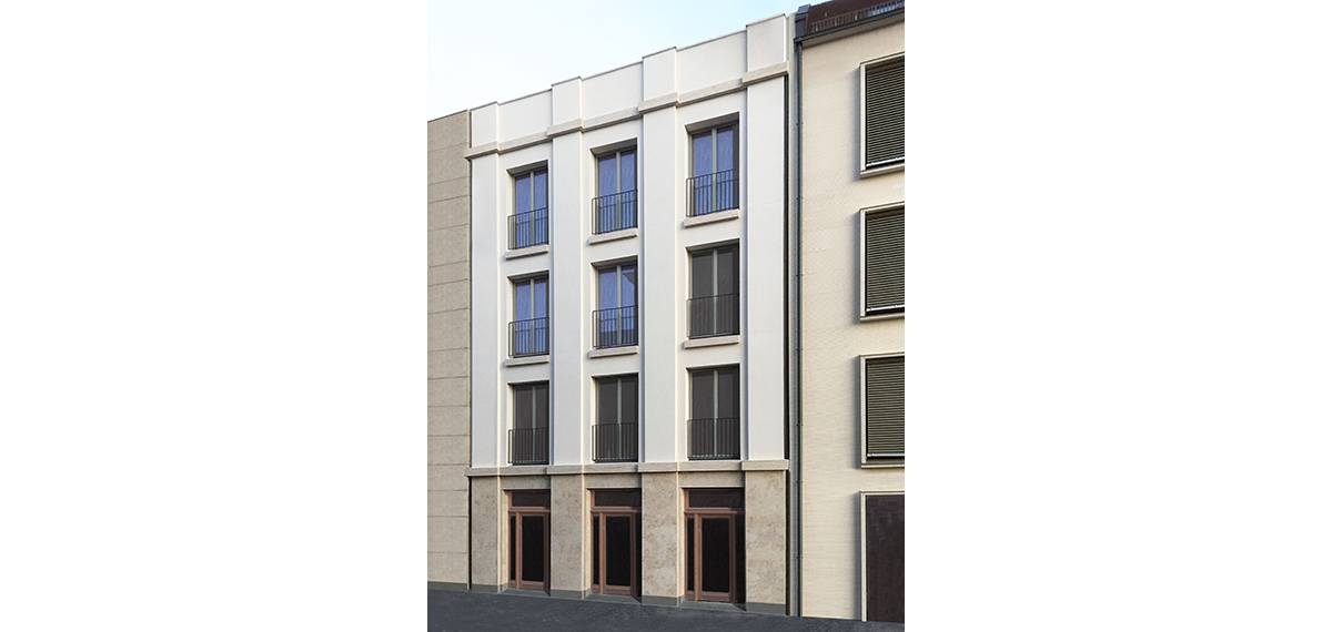 La casa di città sulla piazza Alter Markt. All’interno di un volume con base di 10,5 x 16 m e 17 m di altezza, si trovano cinque piani abitabili. Al piano terra si trovano negozi e l’androne che conduce alla villa urbana; in ciascuno dei quattro piani superiori un appartamento. La facciata sulla piazza è caratterizzata dalla figura dell’’ordine architettonico’, declinato in forma di alti piedestalli e lesene d’ordine gigante.