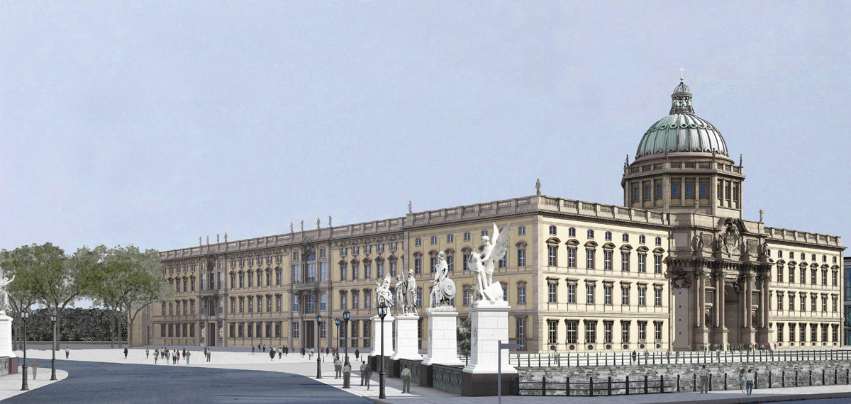 La ricostruzione ‘com’era e dov’era’ della stereometria e delle facciate del ‘palazzo barocco’ – ovvero della parte del Castello di Berlino, ridisegnata a fine Seicento/inizio del Settecento da Schlüter ed Eosander, e della cupola ottocentesca di Stüler – è stata decisa dal Parlamento tedesco nel 2002, e confermata dal programma del Concorso del 2008.