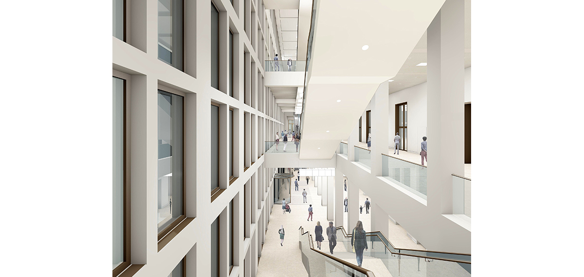 I quattro nuovi corpi interni completano lo Schlüterhof come piazza, e conformano due nuovi cortili-piazza in rapporto con i portali ricostruiti come Porta di Città: lo Schloss-Passage, una ‘via colonnata’ che ricorda un antico Foro, e l’Humboldt Foyer che ricorda il Teatro, con il ricostruito portale-arco di trionfo come ‘fronte di scena’ e i nuovi loggiati come ‘palchi degli spettatori’.