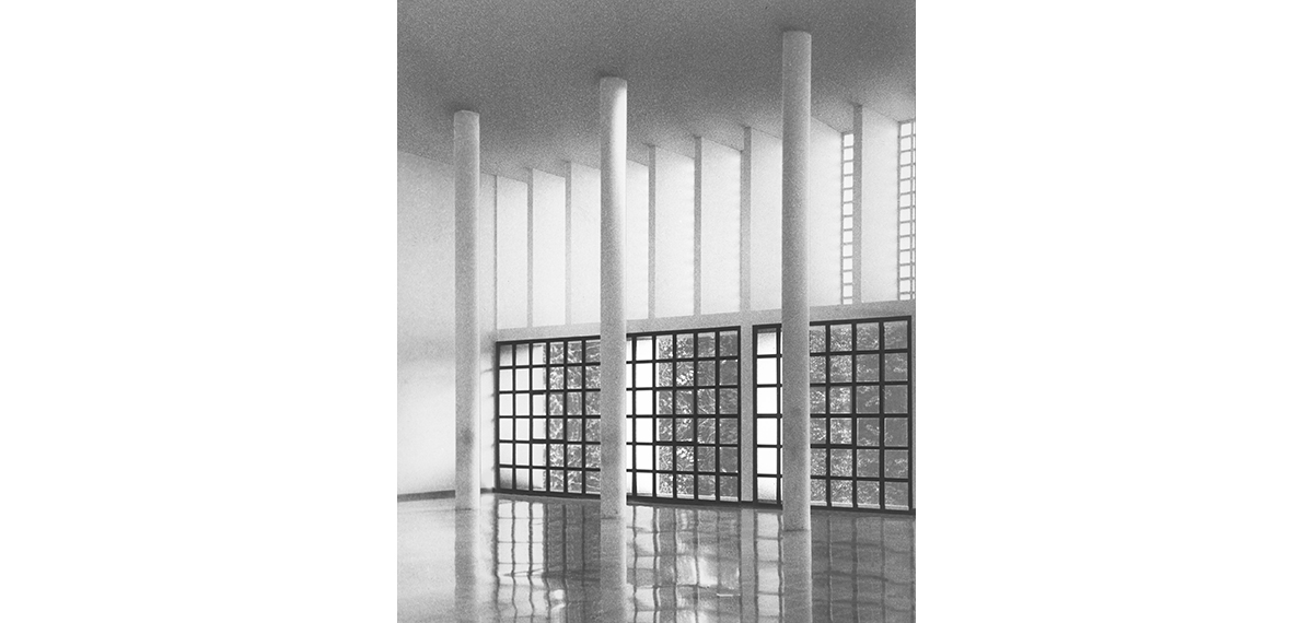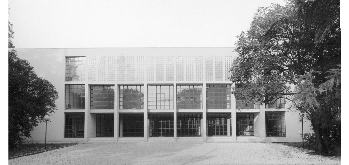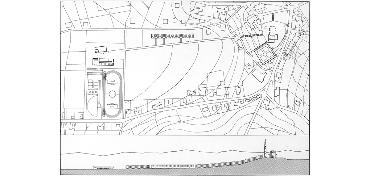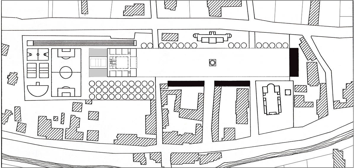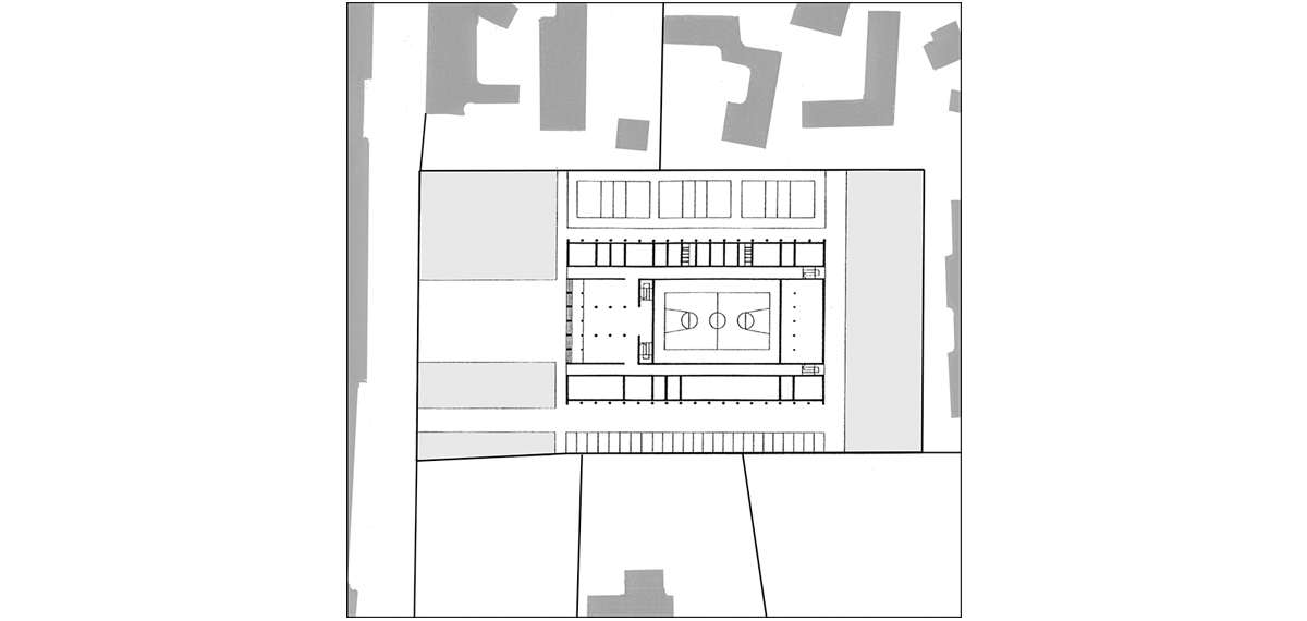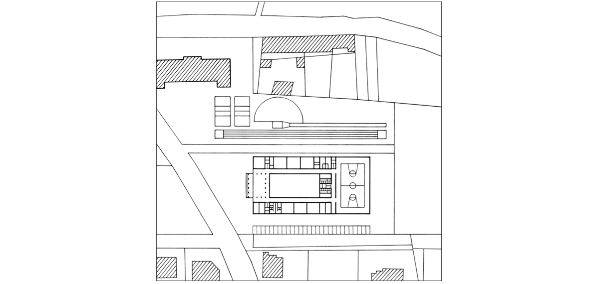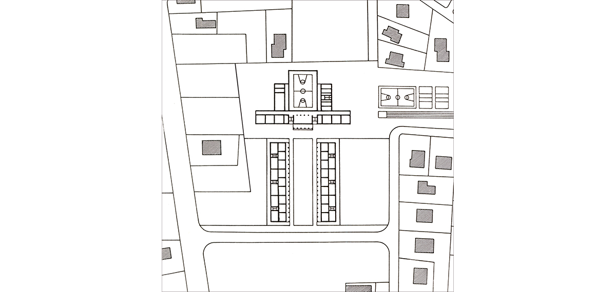 La palestra, i locali per gli spogliatoi e il refettorio sono riuniti in una figura che ricorda la basilica, con la mole dell’aula centrale emergente dai corpi bassi addossati ai suoi fianchi.