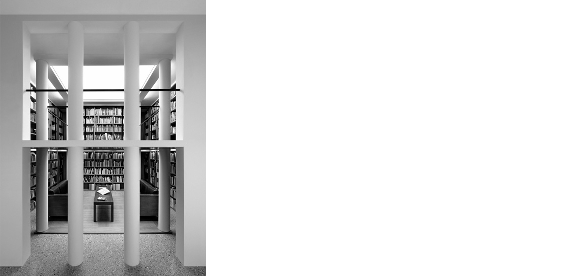 Nella sala di un’abitazione privata, una parete di colonne separa una stanza per i libri da un antistante vestibolo. Colonne di doppia altezza ai quattro angoli, una pedana di legno per ‘terra’ e un telo luminoso per ‘cielo’, distinguono lo spazio centrale per la sosta e la lettura da quello dei percorsi lungo le pareti dei libri.