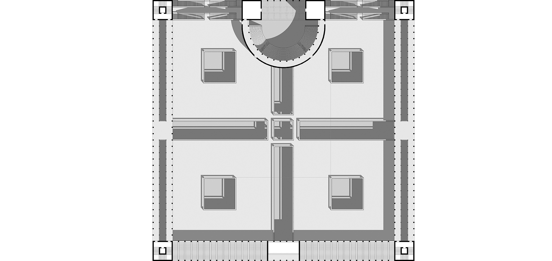 Das Längsschiff ist eine Abfolge von rechteckigen und quadratischen Höfen, die in regelmäßigem Abstand bis zum Dach höher werden und damit das zenitale Sonnenlicht einfallen lassen.
