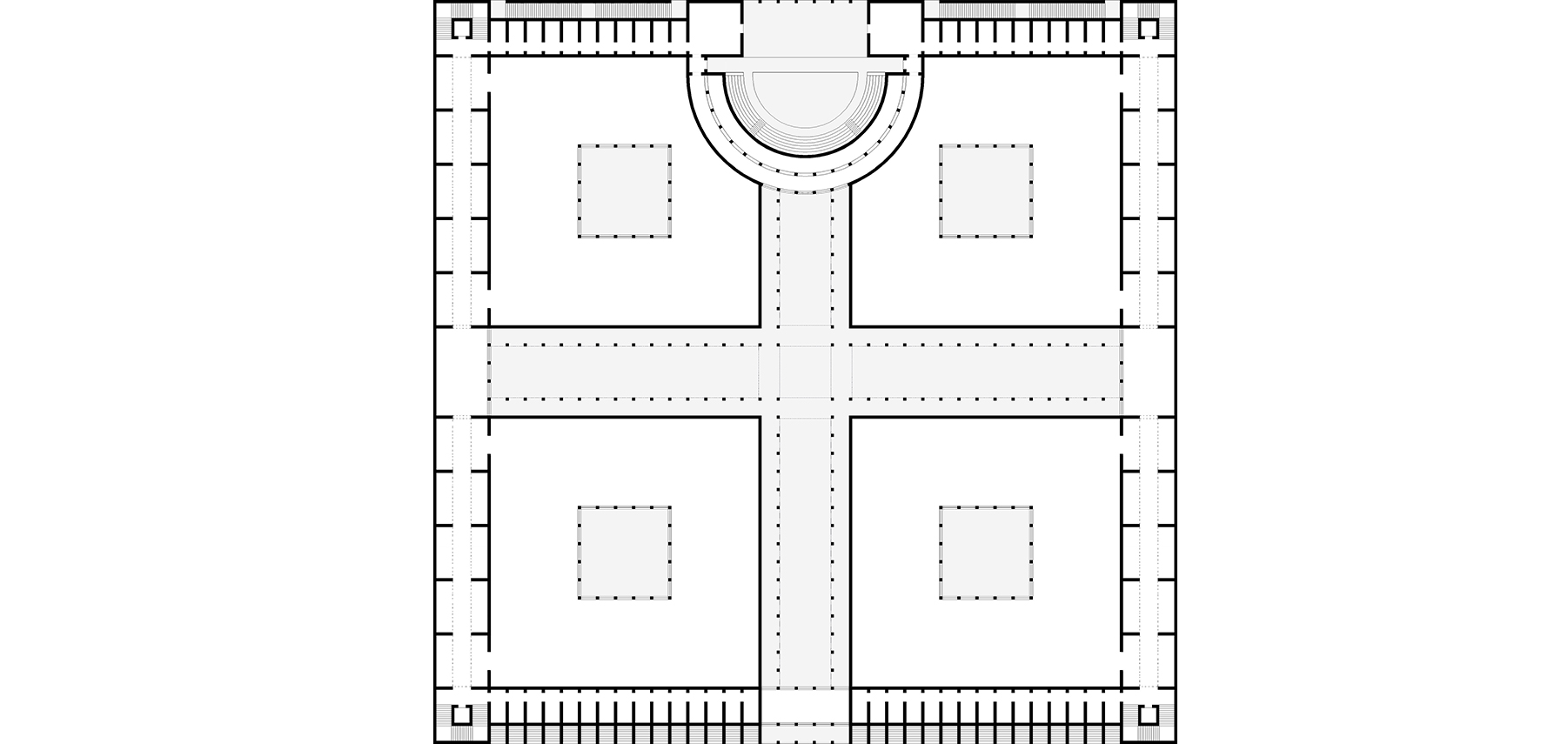 Es ist eine Kombination aus vier parallelen, gleichen Zeilenbauten, einem Längsschiff, sechs Querschiffen und einer hohen Arkade an der Straßenfront.