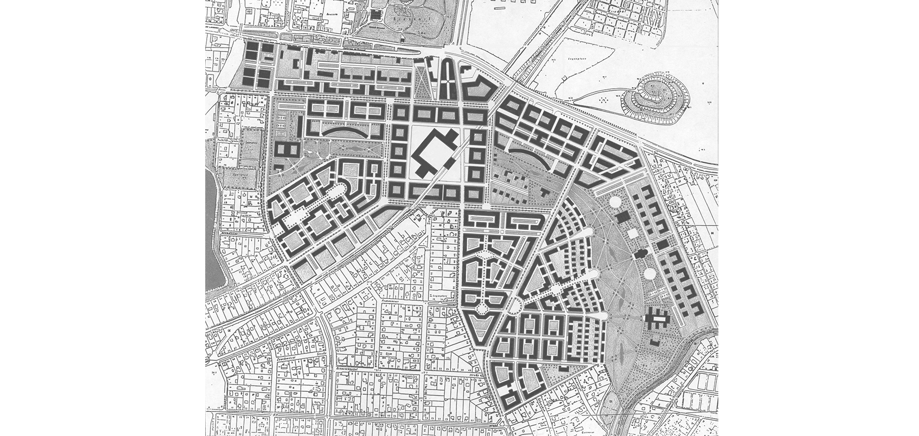 Der Stadtpark. Der Freiraum der Plätze dehnt sich in langen Grünstreifen im Herzen der Wohnquartiere aus. Mehrere öffentliche Bauten befinden sich an den Rändern des Parks, als Blickpunkte langer urbanen Perspektiven.