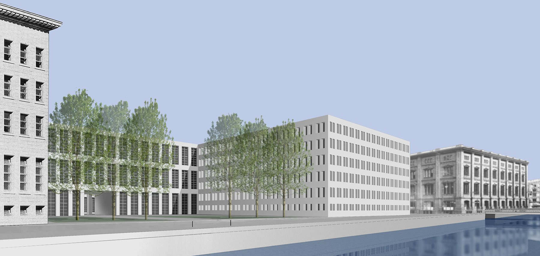 To expand the headquarters of the Ministry of Foreign Affairs, a new building will be added to the large block built in the 1930s for the Reichsbank, in the area that extends to the Werdescher Markt. The sequence of its main places - the courtyard open to the street, the entrance hall, the long ‘courtyard of honor’ - is connected with that of the median axis of the existing building. The building in front of the street is divided into two blocks of a size comparable to that of the nearby Bauakademie of Schinkel. They are connected to each other by the transverse building of the entrance. The eminent place is the long internal 'loggias courtyard', which integrates the new building to the old one.