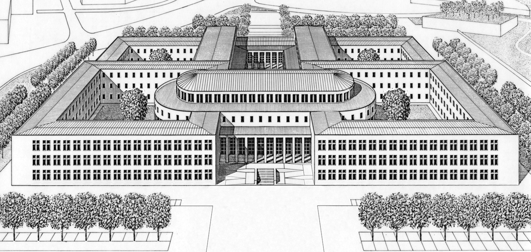Una grande Aula absidata e una corte porticata conformano l’asse centrale degli spazi pubblici; due coppie di simmetriche corti quadrate regolano la diposizione dei corpi di fabbrica di due e tre piani, destinati agli spazi di lavoro del personale. L’insieme dei luoghi aperti e chiusi si inscrive in un recinto rettangolare, interrotto dalla piazzetta antistante all’ingresso, che si congiunge in forma di viale alberato con la strada. La figura della basilica si presenta alla città con la sua mole emergente e con il fronte d’ingresso.